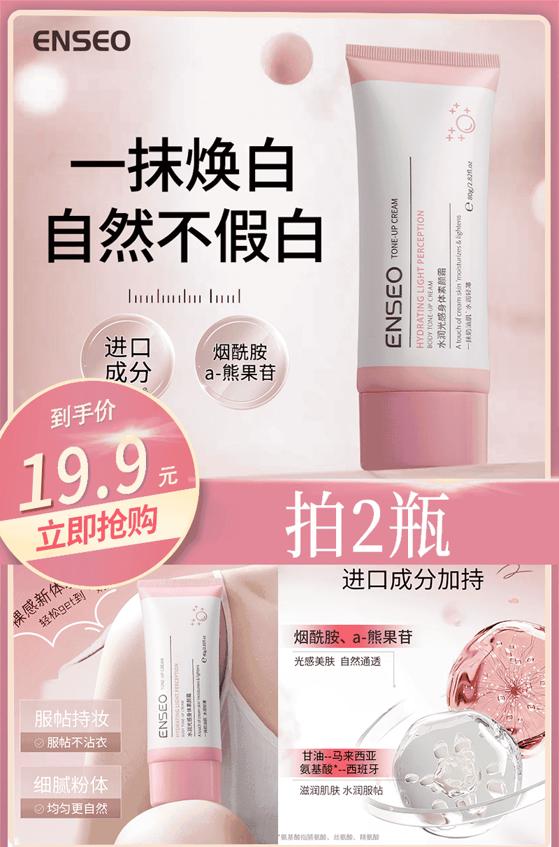夏季露肤全靠它!养肤提亮二合一!不假白超自然! 添加熊果苷、烟酰胺、酸橙果皮油、光果甘草提取物等养肤成分! 提亮肌肤一绝!关键是防水防汗不粘腻 !不用担心蹭衣领袖口!!