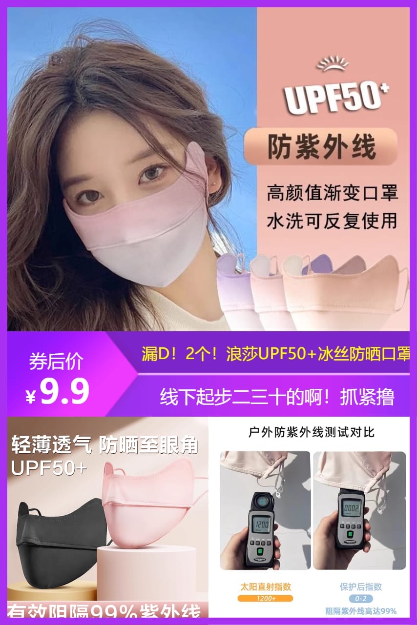 漏D!2个!浪莎UPF50+冰丝防晒口罩